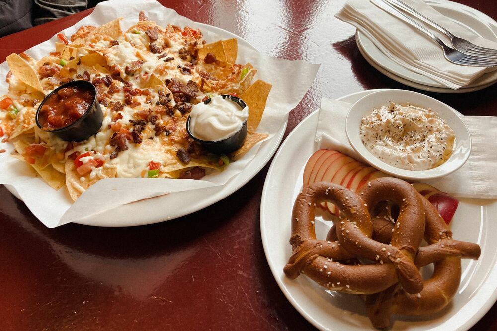 My wonderful mother and I decided to go to a local restaurant: The Madhouse. Located in downtown Port Arthur in the historic Bay and Algoma neighbourhood, they serve excellent pub fare and specialize in whiskey! As we wanted a lighter lunch, we decided to order two appetizers to split. Pictured below, we ordered the Loaded Nachos and Beer Cheese. The Beer Cheese came with local Gouda cheese from Thunder Oak Cheese Farm, as well as apples, and baked pretzels for dipping.